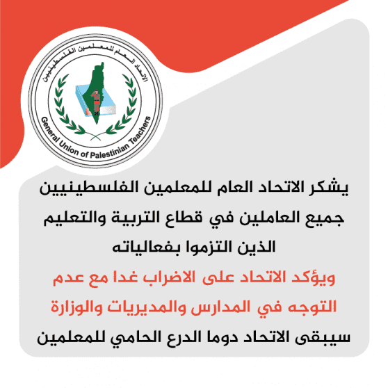 أعلن الاتحاد العام للمعلمين الفلسطينيين، أن يوم الخميس 9 مارس/ آذار 2023، إضراب شامل مع عدم التوجه في المدارس والمديريات في وزارة التربية والتعليم.