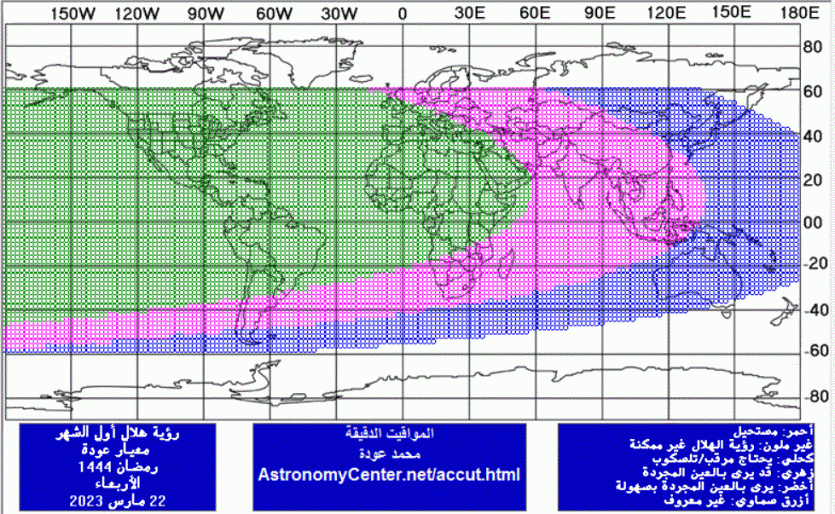 الخارطة المرفقة تبين مدى إمكانية رؤية هلال شهر رمضان يوم الأربعاء 22 مارس من جميع مناطق العالم، بحيث أن: