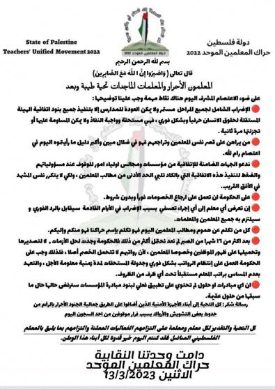 بدوره، أصدر "حراك المعلمين الموحد 2022"، بيانا صحفيا جاء فيه أن "الإضراب الشامل مستمر ولا يمكن العودة للمدارس إلا بتنفيذ كل بنود اتفاقية الهيئة المستقلة، وعلى الحكومة إعادة الخصومات فوراً ودون شروط"، مضيفا أن "اتخاذ أي إجراء تعسفي بحق أي معلم مضرب في الأيام القادمة سيقابله كل المعلمين بردٍ فوري".