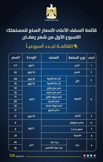 الاقتصاد تنشر قائمة السقف السعري الأعلى للأسبوع الأول من رمضان