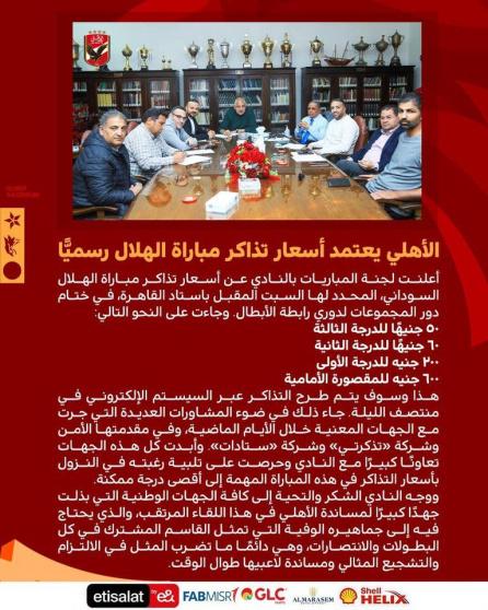 أسعار تذاكر مباراة الأهلي ضد الهلال السوداني جاءت على النحو التالي: