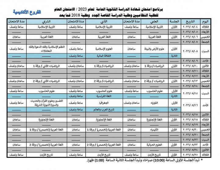 جدول امتحانات الثانوية العامة 2023 في الأردن