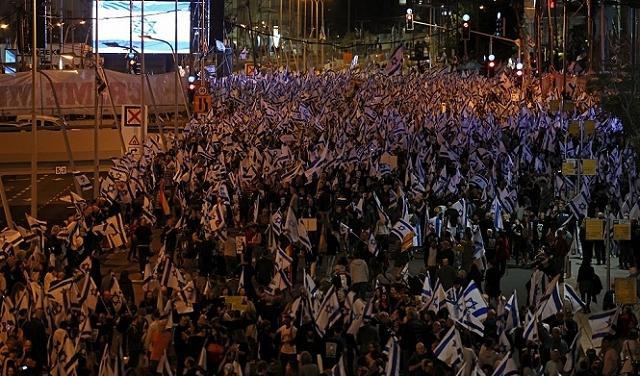 تظاهر عشرات الآلاف في تل أبيب والعديد من المفارق والبلدات ضد حكومة نتنياهو وخطة إضعاف القضاء وتقويض صلاحيات المحكمة العليا، وذلك للأسبوع الخامس عشر على التوالي.