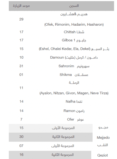 برنامج زيارات أسرى جنين وطوباس لشهر أيار المقبل