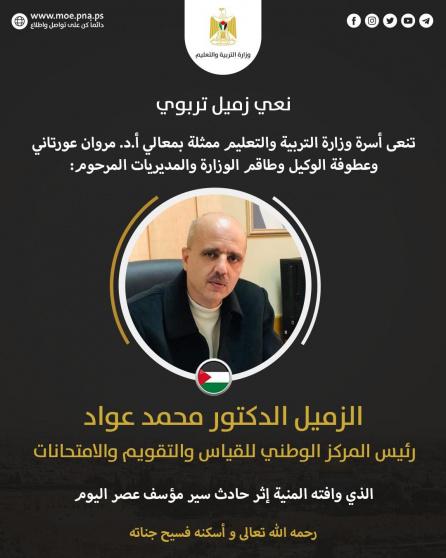 توفي الدكتور محمد عواد مدير عام القياس والتقويم والامتحان في وزارة التربية والتعليم الفلسطينية، جراء حادث سير وقع اليوم الأحد، قرب قرية الساوية جنوب نابلس.