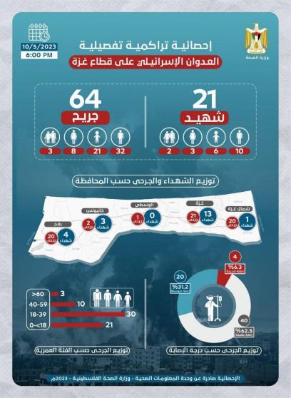 ويدخل عدوان الاحتلال على القطاع اليوم الثالث على التوالي، مخلفا 21 شهيدا و64 جريحا حتى فجر اليوم الخميس، غالبيتهم أطفال ونساء وبعضهم جروحه حرجة وخطيرة، إضافة إلى دمار في شقق سكنية ومنازل وممتلكات خاصة ومواقع وأراضي زراعية.
