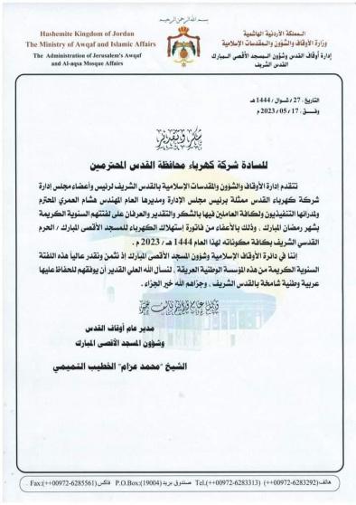 تقدّمت ادارة الأوقاف والشؤون والمقدسات الإسلامية بالقدس، بالشكر والتقدير والعرفان لرئيس وأعضاء مجلس إدارة شركة كهرباء القدس ممثلة برئيس مجلس الإدارة ومديرها العام المهندس هشام العمري ولمدرائها التنفيذيون ولكافة العاملين؛ على لفتتهم السنوية الكريمة بشهر رمضان المبارك.