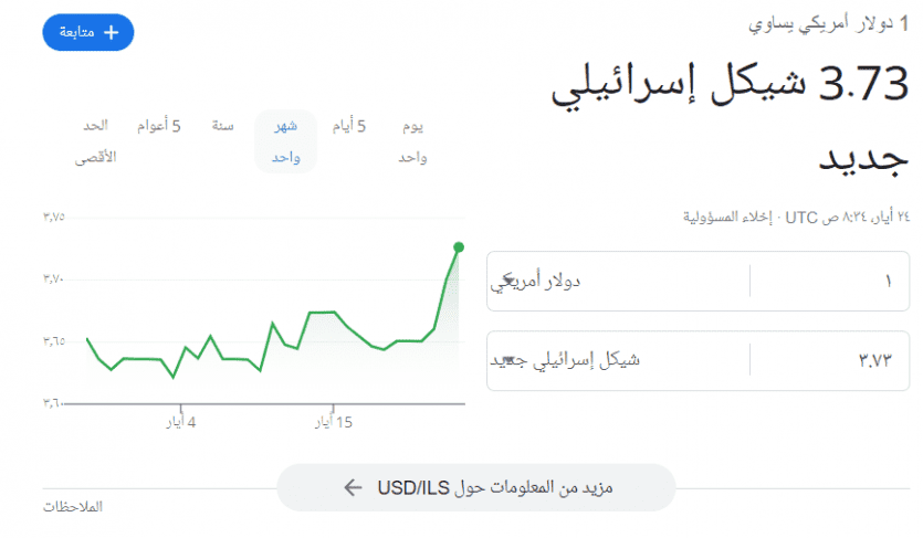 ووصل سعر صرف الدولار مقابل الشيكل الان في فلسطين إلى 3.73 شيكل.