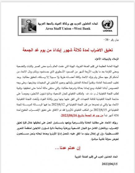 وقال الاتحاد في بيان له، مساء اليوم الخميس، إن تعليق الإضراب سيكون لمدة ثلاثة أشهر بدءا من يوم غد (16/6/2023)، مضيفا أن هذا القرار "جاء لتغليب المصلحة العامة، وتقديرا لمعاناة العاملين وأبنائهم وعموم اللاجئين في المخيمات وخارجها، وتلبية لطلب اللجنة التنفيذية لمنظمة التحرير الفلسطينية، والمكتب التنفيذي للجان الشعبية، ودائرة شؤون اللاجئين، وحرصا على متابعة اللجنة التنفيذية لكافة التعهدات التي اتفق عليها بينها وبين وكالة الغوث وأبلغت اللجنة التنفيذية الاتحاد بها والتي تم تحديدها من قبل اللجنة التنفيذية في 2023/6/12 بما فيها الرسالة المرسلة للجنة التنفيذية في 2023/6/15 من المكتب التنفيذي للأونروا".