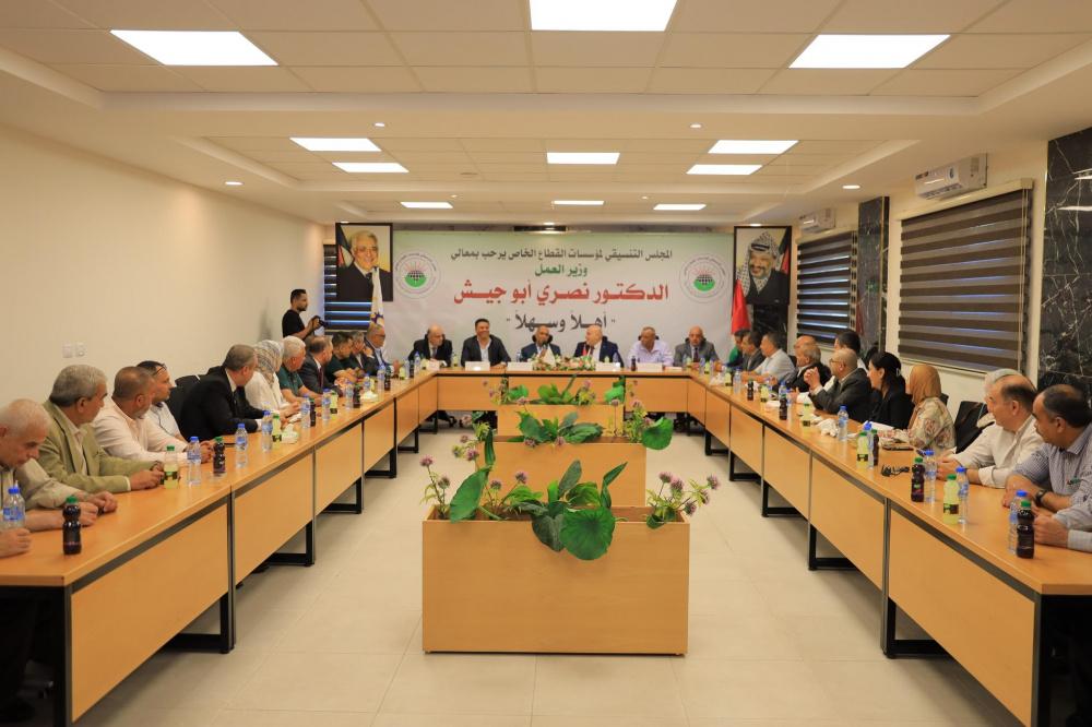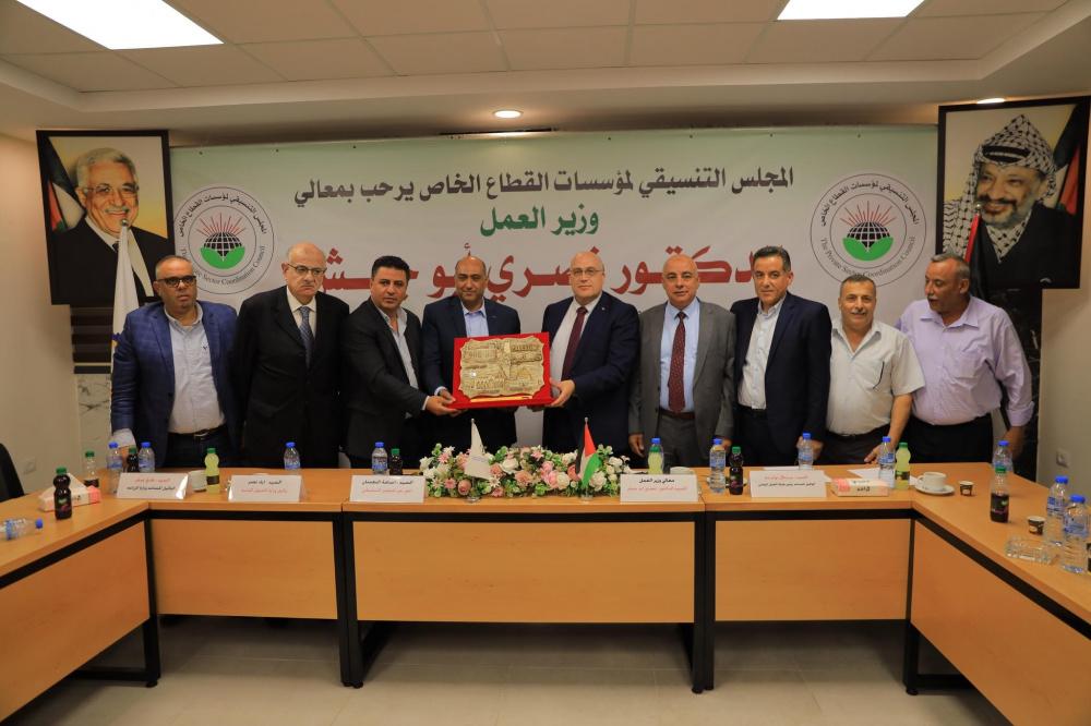 استقبل الاتحاد العام للصناعات الفلسطينية والمجلس التنسيقي لمؤسسات القطاع الخاص وزير العمل د نصري أبو جيش، السيد بلال دوابة وكيل مساعد رئيس هيئة العمل الوطني ،والسيد طارق صقر الوكيل المساعد وزارة الزراعة، والسيد اياد نصر وكيل وزارة الشؤون المدنية، وذلك بمقر الاتحاد العام للصناعات الفلسطينية، وكان في استقبال الوزير أعضاء المجلس التنسيقي وعلى رأسهم أمين سر المجلس السيد أسامة النعسان ورؤساء مؤسسات القطاع الخاص ورؤساء الاتحادات التخصصية والسيدة أمل الوزير رئيس المجلس التاسيسي للسيدات الصانعات بلاضافة الى عدد من الشخصيات الاعتبارية .