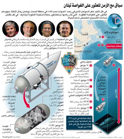 وويبلغ طول "تيتان" 6.7 متر، وبدأت نزول الأعماق صباح الأحد، وفقدت الاتصال مع المركبة الأم على السطح خلال ما كان ينبغي أن يكون عملية غوص لمدة ساعتين.