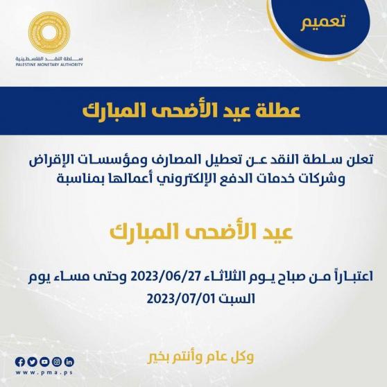 سلطة النقد الفلسطينية تحدد موعد إجازة عيد الأضحى للبنوك