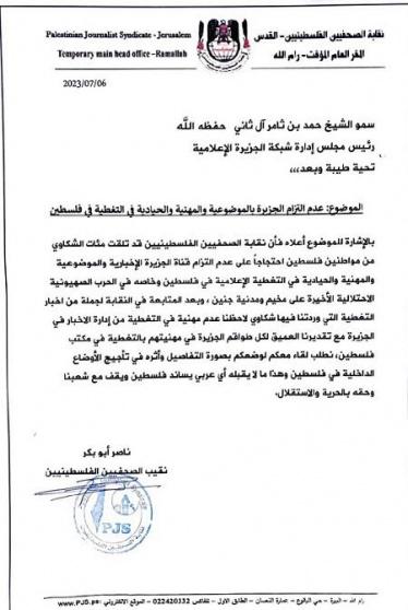 وقالت النقابة في رسالتها إنها تلقت مئات الشكاوى من مواطنين فلسطينيين حول عدم التزام "الجزيرة" بالموضوعية والمهنية والحيادية في التغطية الإعلامية في فلسطين، خاصة في الحرب الأخيرة على مدينة جنين ومخيمها، وبعد متابعة النقابة لجملة من أخبار التغطية التي لاحظت فيها عدم مهنية في التغطية من قبل إدارة الأخبار، مؤكدة تقديرها لكل طواقم الشبكة في مهنيتها بالتغطية في مكتب فلسطين.