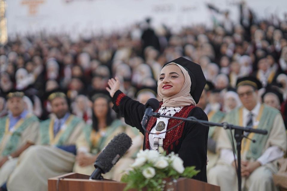 وباركت خريجة الحقوق إسلام التلاحمة في كلمة الخريجين لزملائها وذويهم تخرجهم، وتابعت "في هذه المحطة من الحياة، تعرفنا على زملاء من كل ثرى فلسطين، هنا توحد الوطن تحت راية القدس، هنا كانت فلسطين ولا زالت بوابتنا نحو الوحدة والحرية، وهنا تجمّع المحاضرون والمحاضرات في أروقة القاعات والمختبرات فكانوا معلمي ومعلمات الخير، وكانوا سندنا وظلنا طيلة هذه السنوات، فيا جامعة القدس هنيئًا لك بهذه الكوكبة من الهيئة التدريسية، وهنيئًا لك بهذه الأقمار التي تزين سماءك العالية، والتي تبوأت مناصب كبيرة حتى رسمت القدس عروسًا على أبوابها".