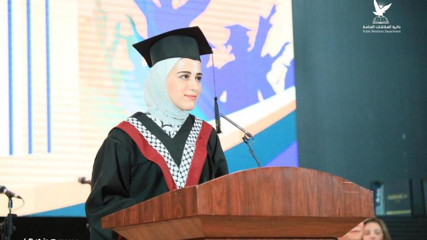 وألقت الطالبة خولة شعبلو الأولى على الكليات العلمية في الجامعة كلمة أوائل الجامعة أهدت فيها نجاحها للوطن الجريحِ وللشهداء وذويهم وباركت فيها لزميلاتها وزملائها قالت فيها: "أقف أمام هذه الوجوه النّيرة، والكوكبة المبدعة، لأمثل كل مكرَّم ومكرَّمة في هذا الحفل البهيج، من تحملوا الصعاب وتخطوا العثرات من أجل أن يصيروا تعبهم مجدا ينتفع به، وإن أفضل أثرٍ تتركه الأجيال للأجيال هو العلم، وإن شعبنا الفلسطيني الصامد خير مثال على التحدي والإصرار، فرغم كل ما يعانيه من حصار وويلات وصعوبات إلا أنه يسير ثابتاً نحو العلم والمجد".
