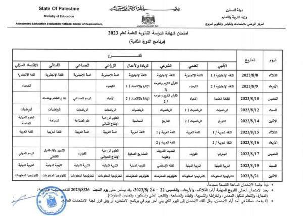 نشرت وزارة التربية والتعليم، اليوم الخميس، جدول امتحانات "الدورة الثانية" لامتحانات الثانوية العامة في الأراضي الفلسطينية للعام 2023.