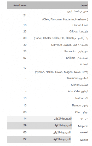 أعلن مكتب اللجنة الدولية للصليب الأحمر في جنين، اليوم الاثنين، عن برنامج مواعيد زيارات ذوي الأسرى في محافظتي جنين وطوباس لشهر آب المقبل على النحو التالي: