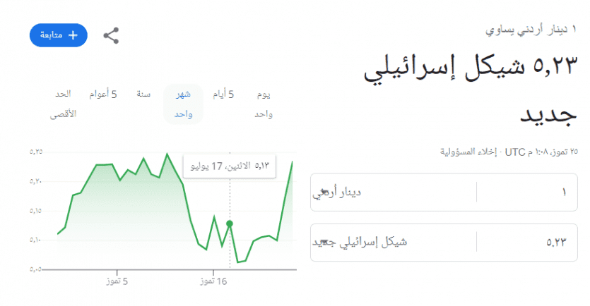 وبلغ سعر صرف الدينار الآن مقابل الشيكل عند 5.23 بعد أن سجل صباح اليوم 5.17 شيكل.
