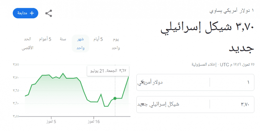 وبلغ سعر صرف الدولار الآن مقابل الشيكل عند 3.70 بعد أن سجل صباح اليوم 3.66 شيكل.