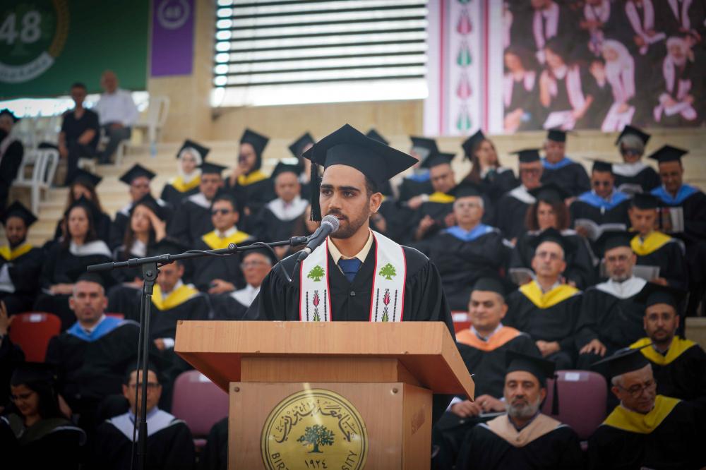 وفي كلمة الخريجين، التي قدمها الطالب سري دار يوسف من تخصص اللغة العربية، أعرب عن اعتزازه بجامعة بيرزيت وأساتذتها وتميز الجامعة أكاديمياً ووطنياً واجتماعيا. وخاطب الخريجين والخريجات قائلاً: " أيها الأصدقاء الأعزاء، تعلّموا حمل القرطاسِ والقلم، قبل حمل البندقية، فالحرّيةُ من دونِ وعيٍ شكلٌ من أشكالِ الفوضى".