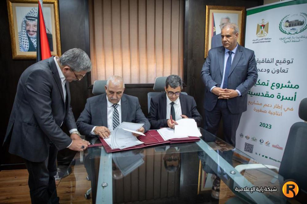 وقعت وكالة بيت مال القدس الشريف ومحافظة القدس اليوم الأربعاء اتفاقية تعاون ودعم مشاريع تمكين أسر مقدسية في إطار مشاريع انتاجية صغيرة بحضور المدير المكلف بتسيير وكالة بيت مال القدس الشريف، الدكتور محمد الشرقاوي.
