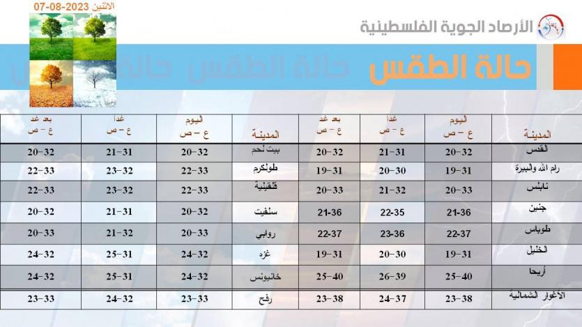 الاثنين: يكون الجو حارًا في معظم المناطق وشديد الحرارة في الأغوار، ولا يطرأ تغير يذكر على درجات الحرارة مع بقائها أعلى من المعدل العام بحدود درجتين مئويتين، والرياح شمالية غربية خفيفة إلى معتدلة السرعة تنشط في ساعات المساء، والبحر خفيف إلى متوسط ارتفاع الموج.