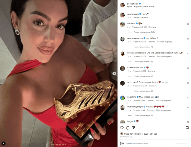 وظهرت جورجينا رودريغيز في إحدى الصور المنشورة عبر حسابها على موقع "إنستغرام" وهي ترتدي فستانا أحمر اللون، وتحمل جائزة هداف بطولة كأس الملك سلمان التي حسمها رونالدو "صاروخ ماديرا" لصالحه برصيد 5 أهداف.
