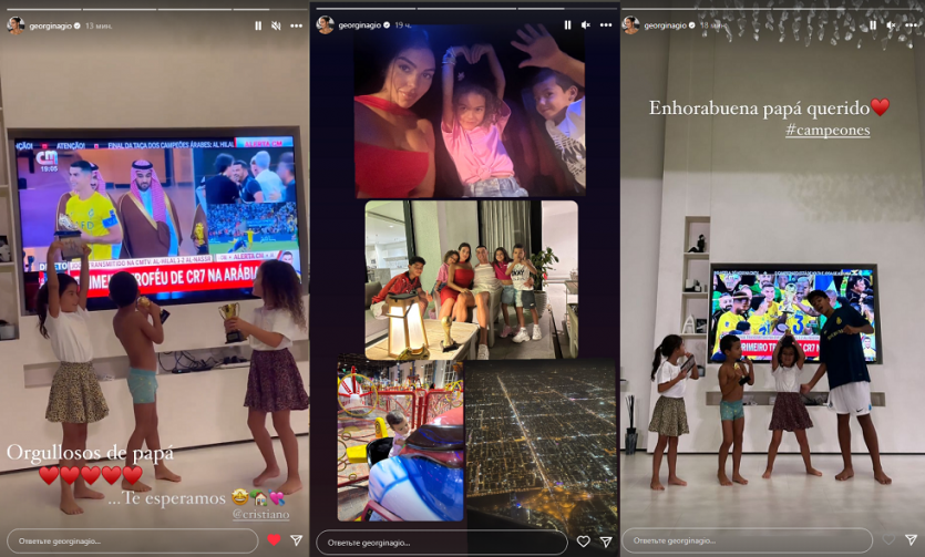 وشاركت جورجينا متابعيها على حسابها الرسمي في تطبيق "إنستغرام" بعدد من اللقطات والصور رفقة كريستيانو رونالد وأطفالهما، واحتفالاتهم بتتويج الدون بلقب بطل الأندية العربية.