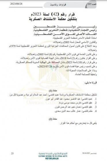 أصدر الرئيس محمود عباس ، قراراً، يقضي بتشكيل محكمة الاستئناف العسكرية.