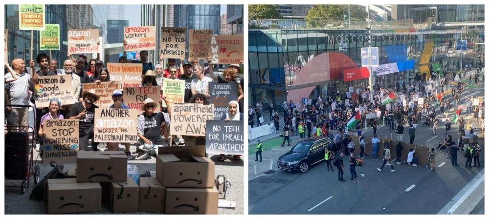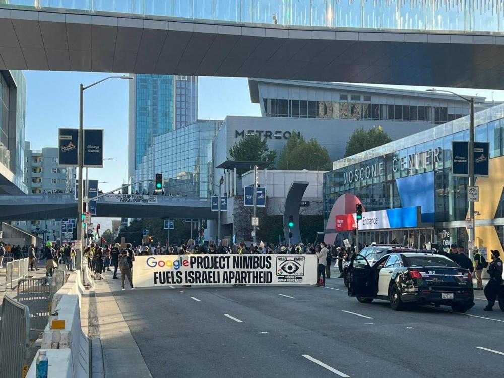 شارك المئات من موظفي شركة غوغل وأنصار الحق الفلسطيني، في تظاهرة في مدينة سان فرانسيسكو بولاية كاليفورنيا، تضامنا مع الشعب الفلسطيني واحتجاجا على انعقاد المؤتمر السنوي لتكنولوجيا الغيوم لشركة غوغل.