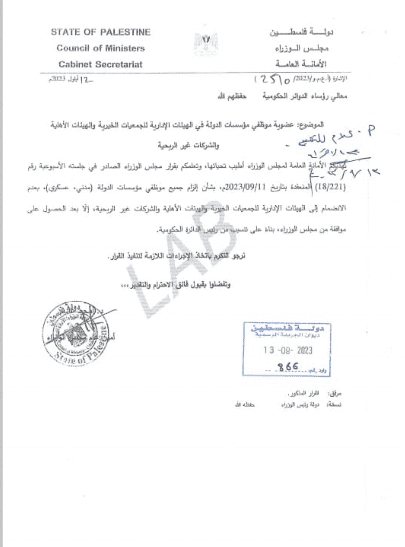 أصدر مجلس الوزراء في جلسته الأخيرة المنعقدة بمدينة رام الله في 9 أيلول/ سبتمبر؛ قرارا يمنع فيه الموظفين العموميين (موظفي مؤسسات الدولة) المدنيين والعسكريين، من شغل عضوية في الهيئات الإدارية للجمعيات الخيرية والهيئات الأهلية والشركات غير الربحية.