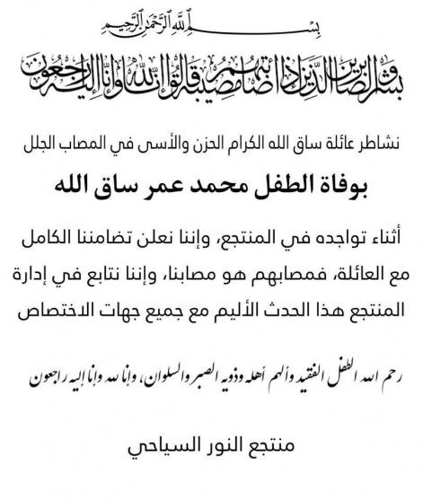 وفي السياق، أصدر منتجع النور السياحي في غزة، مساء اليوم الخميس، بيانا، عقّب فيه على وفاة الطفل محمد عمر ساق الله، قال فيه أن إدارة المنتجع تتابع الحدث الأليم مع جهات الاختصاص.