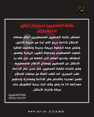 و استنكرت النقابة خطوة الاحتلال هذه معتبرة انها تندرج في سياسة تكميم الافواه ومحاولة تغييب الرواية الفلسطينية