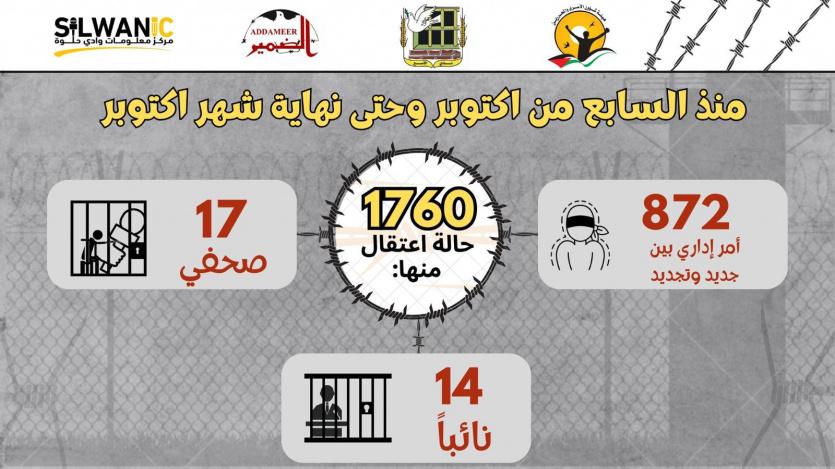 صعّد الاحتلال من حملات الاعتقال بعد السابع من أكتوبر، وبلغت حالات الاعتقال حتى نهاية أكتوبر (1760)، شملت كافة الفئات، حيث بلغ متوسط عمليات الاعتقال اليومية بعد هذا التاريخ، نحو (73) حالة اعتقال، وهذه النسبة تزيد بثلاثة أضعاف عن حملات الاعتقال التي كانت تنفّذ من قبل، ومن بين حالات الاعتقال (17) صحفيًا، فيما بلغ عدد النواب الذين جرى اعتقالهم (14) وعلى صعيد جريمة الاعتقال الإداري فقد أصدر الاحتلال (872) أمرًا بعد السابع من أكتوبر، غالبيتها أوامر جديدة، هذا وتشير مؤسسات الأسرى إلى أنّ حملات الاعتقال تركزت بعد هذا التاريخ في محافظة الخليل وبلداتها، حيث بلغت حالات الاعتقال فيها (500)، تليها القدس التي سُجل فيها أكثر من (400) حالة اعتقال.