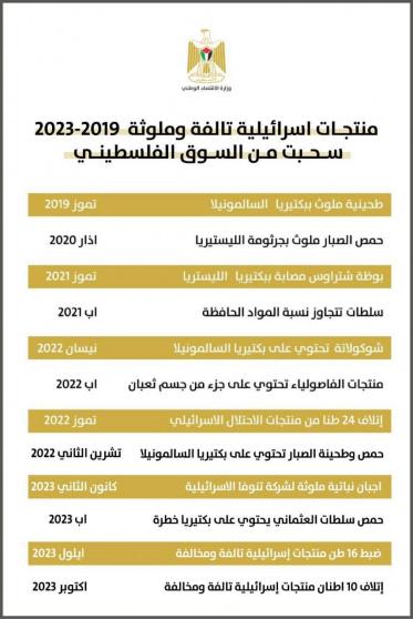 نشرت وزارة الاقتصاد الفلسطيني قائمة بالمنتجات الإسرائيلية الملوثة والتالفة والتي سحبت من السوق الفلسطيني من عام 2019-2023.