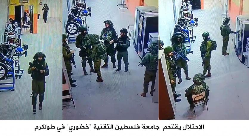 ولفتت الوزارة، في بيان لها، إلى أنّ قوات الاحتلال اقتحمت، اليوم، حَرَم جامعة فلسطين التقنية "خضوري" في طولكرم وداهمت مُختبرات ومَشاغل هندسة السيارات (مبنى الطاقة سابقاً)، وعاثت بممتلكاتها خراباً.