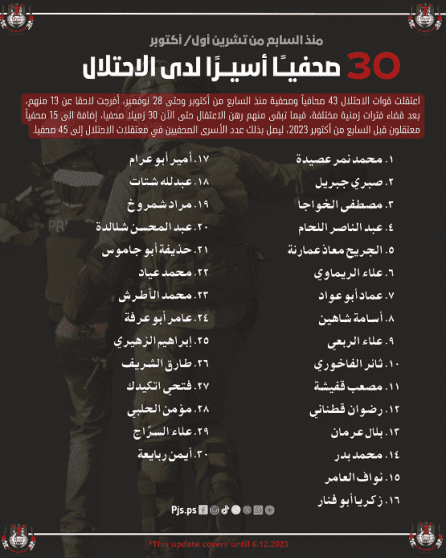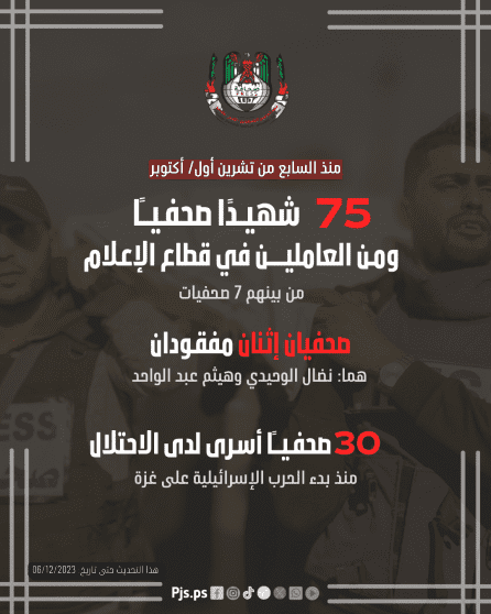وأوضحت في تقرير صادر عنها اليوم الأربعاء، إن 75 صحفياً وعاملاً في قطاع الإعلام استشهدوا، وأصيب نحو 80 صحفياً بجروح، وفقد صحفيان اثنان، بينما قصف الاحتلال منازل عائلات 60 صحفياً، ودمر مقار 63 مؤسسة ومكتبا صحفي، وعطل عمل 25 إذاعة محلية (24 في غزة وواحدة في الضفة)، وأغلق وقيد عمل 3 وسائل إعلامية، واعتقل 43 صحفيا منهم 41 في الضفة واثنان في غزة، حيث لا زال منهم 30 قيد الاعتقال، وأغلبهم تم تحويلهم للاعتقال الإداري.