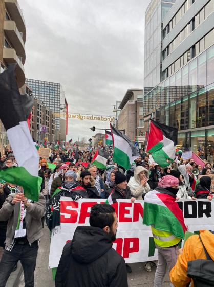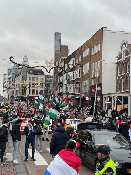 وشارك فيها ابناء الجالية الفلسطينية والعربية ومتضامنون هولنديون رافعين الاعلام الفلسطينية واليافطات المنددة بالاحتلال الاسرائيلي، مستنكرين استمرار حرب الابادة الجماعية التي يرتكبها الاحتلال الاسرائيلي بحق الشعب الفلسطيني ومطالبين بوقف اطلاق النار في غزة، ووقف جرائم جيش الاحتلال الاسرائيلي بحق الاطفال و النساء و الجرحى و كبار السن و تدميره المستشفيات و المدارس و مراكز الايواء والاغاثه، و قتله الصحافيين و الاعلاميين، كما طالبوا بفتح المعابر لادخال المساعدات الانسانية والطبية الى قطاع غزة المحاصر.