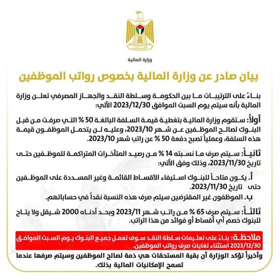 ثالثاً: سيتم صرف 65 % من راتب شهر 11/2023 وبحد أدناه 2000 شيقل ولا يتاح للبنوك خصم أي أقساط أو فوائد من هذا الراتب.