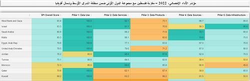 حصلت دولة فلسطين ممثلة بالجهاز المركزي للإحصاء الفلسطيني على المرتبة الأولى على مستوى منطقة الشرق الأوسط وشمال أفريقيا في مؤشر الأداء الإحصائي SPI، وذلك ضمن تقييم البنك الدولي للنظم الإحصائية الوطنية للعام 2022، حيث حصلت على تقييم 83.4% في المؤشر الكلي، والذي يتكون من خمس ركائز رئيسية ضمن 22 بُعد؛