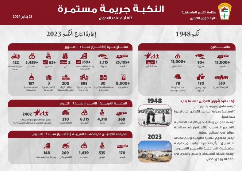 قالت دائرة شؤون اللاجئين في منظمة التحرير الفلسطينية، إن حرب الإبادة ضد شعبنا الفلسطيني ومخططات التهجير والتدمير والقتل لم تتوقف منذ 76 عاما، بل تتصاعد وتزداد رقعتها، وأضافت الدائرة في بيان صدر عنها، اليوم الأحد، أنه يكاد لا يمر يوم واحد إلا وتتعرض مخيماتنا الصامدة إلى الاقتحامات وما يرافقها من قصف وقتل وتدمير للبنى التحتية، وهدم المنازل والمنشآت العامة والخاصة، والاعتقالات المصحوبة بالقمع الوحشي والتنكيل.