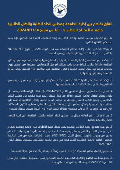 اتفاق تفاهم بين ادارة جامعة النجاح و مجلس اتحاد الطلبة والكتل الطلابية