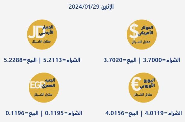 جاءت أسعار صرف العملات مقابل الشيقل الإسرائيلي، اليوم الإثنين، بحسب سلطة النقد الفلسطينية، على النحو التالي: