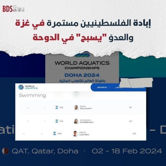 تستنكر الحملة الفلسطينية للمقاطعة الأكاديمية والثقافية لإسرائيل (PACBI) بأشد العبارات سماح الجهات الرسمية القطرية بمشاركة وفد رياضي ممثل عن نظام الاستعمار الاستيطاني والأبارتهايد الإسرائيليّ في بطولة العالم للألعاب المائية التي تعقد في الدوحة ابتداءً من يوم الجمعة القادم 02/02/2024. فبينما يستمرّ العدوّ الإسرائيليّ بشنّ حربه الإبادية على شعبنا الفلسطينيّ المحاصر في قطاع غزة، متجاهلاً قرارات محكمة العدل الدولية، وبينما تتصاعد أصوات أصحاب الضمائر الحيّة المطالبة بطرد العدوّ من كافة المحافل الدولية، بما يشمل المحافل الرياضية، يعتبر سماح دولة عربية شقيقة بمشاركة وفدٍ إسرائيليّ أمراً يتجاوز التطبيع.