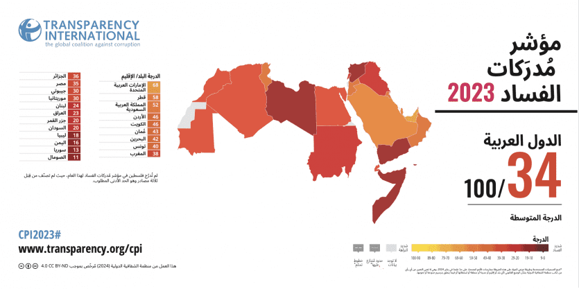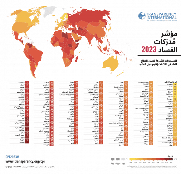 أصدرت منظمة الشفافية الدولية نتائج مؤشر مدركات الفساد (CPI) للعام 2023، حيث لم تشر نتائج المؤشر إلى تغير ملحوظ في واقع مدركات الفساد في منطقة الشرق الأوسط وشمال إفريقيا بشكل عام، إذ بقي إجمالي المُؤشر منخفضاً (37.5 إلى 38 من 100). ويعد مؤشر مدركات الفساد مؤشراً مركباً يستخدم لقياس مدركات الفساد في القطاع العام فقط، ويركز على البيئة التشريعية والسياسية والاقتصادية ومستويات وإجراءات الحوكمة في البلدان. ويعتمد المؤشر على 13 مصدر معلومات مستقل أغلبها تقارير واستطلاعات لخبراء في كل بلد، يتم إعدادها بواسطة معاهد دراسات ومؤسسات دولية مستقلة، ويتولى تحليلها خبراء خارجيين تعينهم الشفافية الدولية. ولاعتماد إضافة أي دولة على المؤشر يشترط توفر 3 من المصادر المعتمدة على الأقل وهو الأمر الذي لم يمكن منظمة الشفافية الدولية من إدراج فلسطين في المؤشر لعدم توفر ثلاث مصادر للمعلومات من المصادر المعتمدة، علما بأن المؤشر يمنح الدرجة من صفر الى 100 لكل دولة، حيث صفر يعني الأكثر فسادًا و 100 الأكثر نزاهة وأقل فساداً.