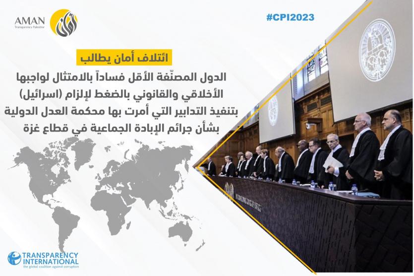 على ضوء نتائج المؤشر لهذا العام؛ طالب الائتلاف من أجل النزاهة والمساءلة -أمان، الفرع الوطني لمنظمة الشفافية الدولية، الدول التي حازت على أعلى علامات، والتي تمثل الدول الأكثر نزاهة والأقل فساداً على مؤشر مدركات الفساد بأن تمتثل لواجبها الأخلاقي والقانوني والضغط لإلزام (اسرائيل) تنفيذ قرار محكمة العدل الدولية ومن ضمنها الإجراءات المؤقتة التي أمرت بها دون تأخير، وذلك بشأن جرائم الإبادة الجماعية التي ترتكبها ضد الشعب الفلسطيني في غزة، وذلك بعدما أكدت المحكمة معقولية الاتهام الذي تقدمت به جنوب أفريقيا تجاه (اسرائيل)، محمّلة إياها المسؤولية عن أفعالها، وذلك بموجب اتفاقية منع الإبادة الجماعية.