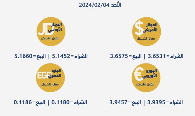 جاءت أسعار صرف العملات مقابل الشيقل الإسرائيلي، اليوم الأحد، بحسب سلطة النقد الفلسطينية، على النحو التالي: