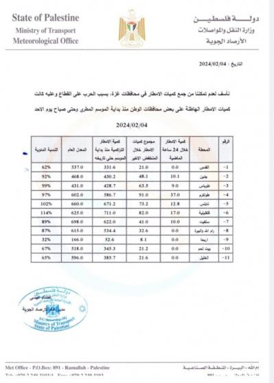 وعبرت دائرة الأرصاد الجوية عن أسفها لعدم تمكنها من جمع كميات الأمطار في محافظات غزة، بسبب الحرب الإسرائيلية المتواصلة على القطاع.