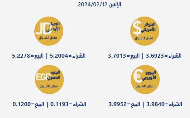 جاءت أسعار صرف العملات مقابل الشيقل الإسرائيلي، اليوم الإثنين، بحسب سلطة النقد الفلسطينية، على النحو التالي: