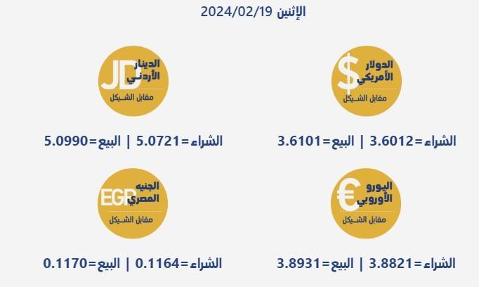 جاءت أسعار صرف العملات مقابل الشيقل الإسرائيلي، اليوم الإثنين، بحسب سلطة النقد الفلسطينية، على النحو التالي: